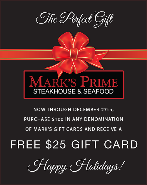 From now through December 27th – receive an additional $25 for every $100 gift card purchase. Happy Holidays.